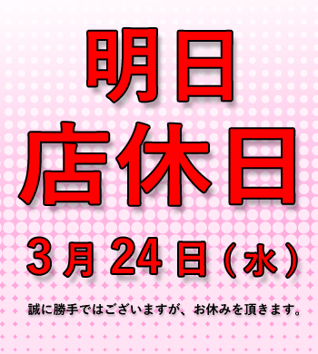 ◎明日24日(水)は誠に勝手ながら『 店 休 』とさせていただきます。